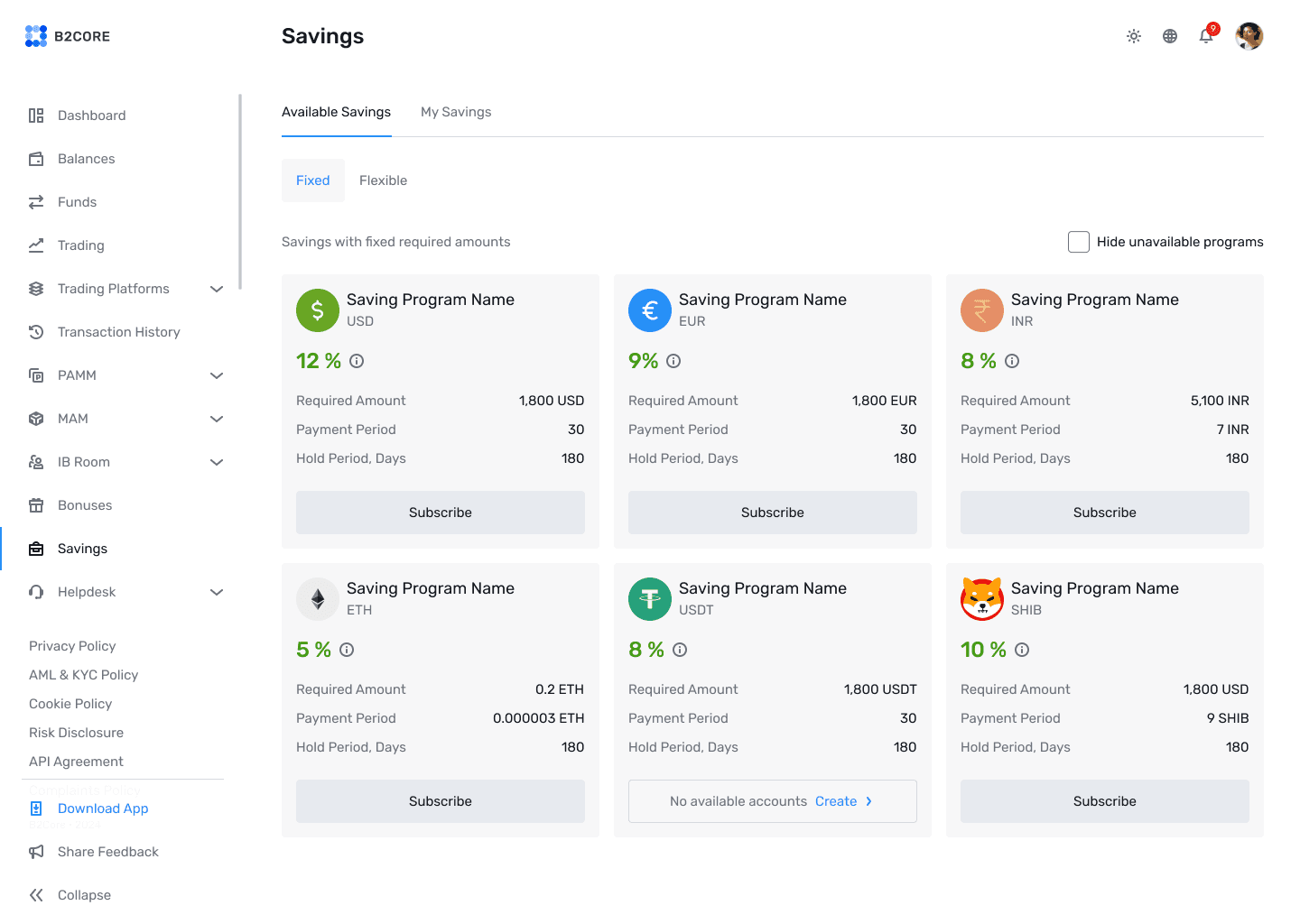 Help your clients grow their wealth with B2CORE’s Savings feature. Offer interest-earning accounts with customisable terms and rewards for your loyal clients.